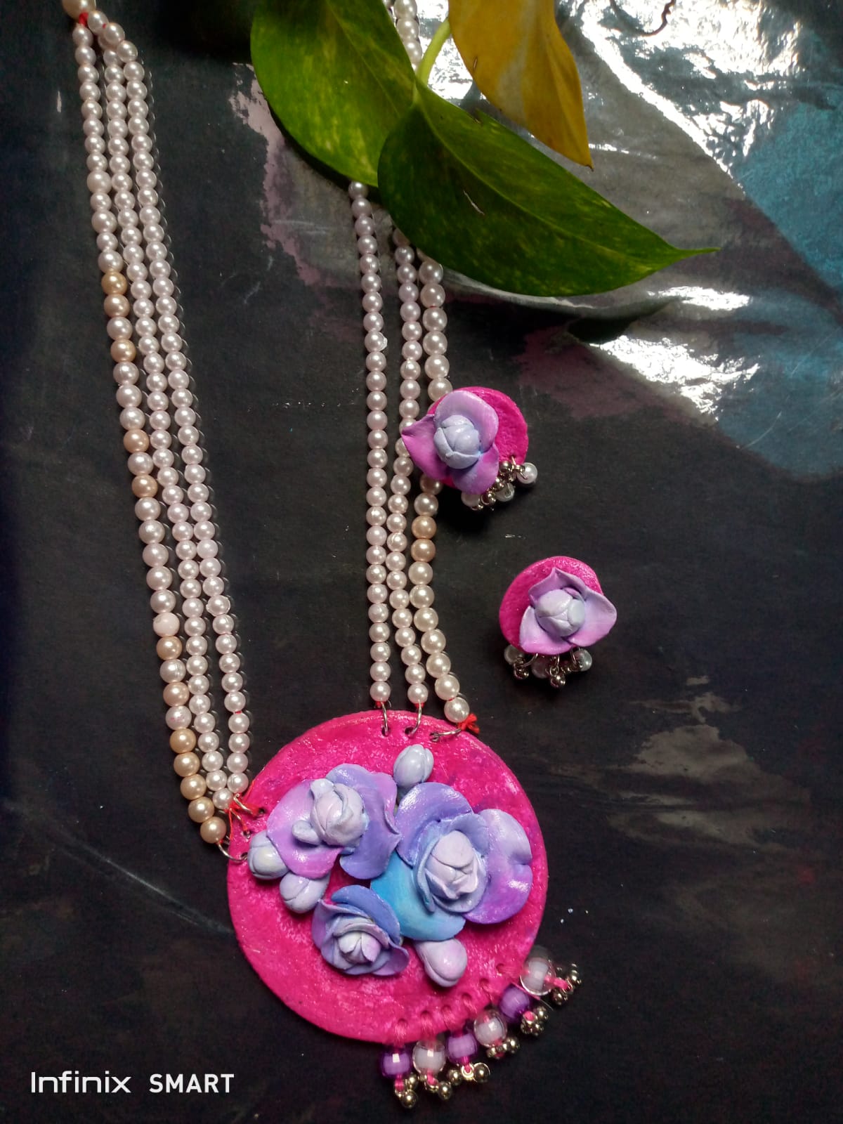 Key points : Handmade pearl necklace, floral pendant jewelry set, pink and purple flower jewelry, traditional Indian necklace set, eco-friendly handmade jewelry, ethnic jewelry for women, wedding floral jewelry set.