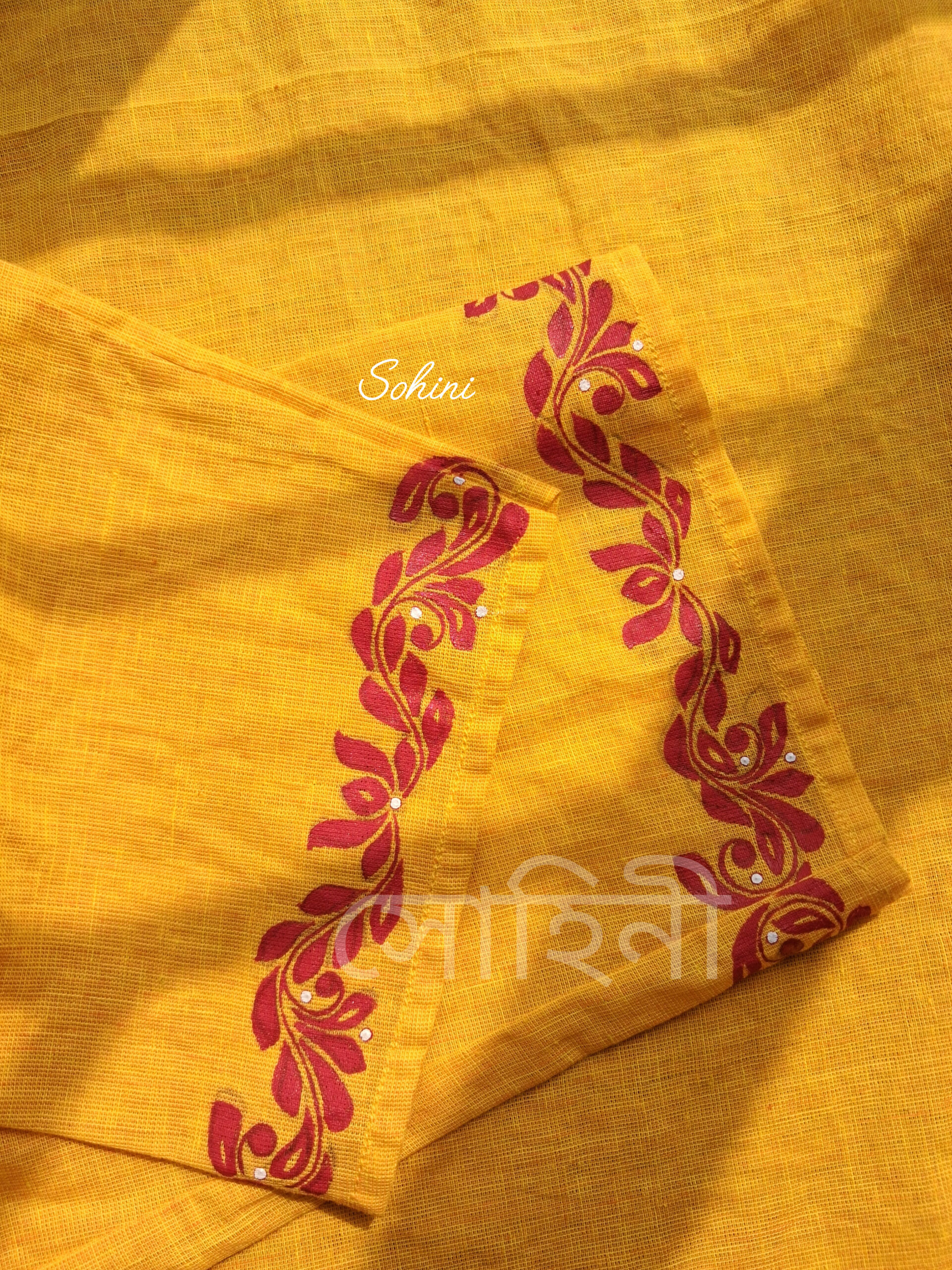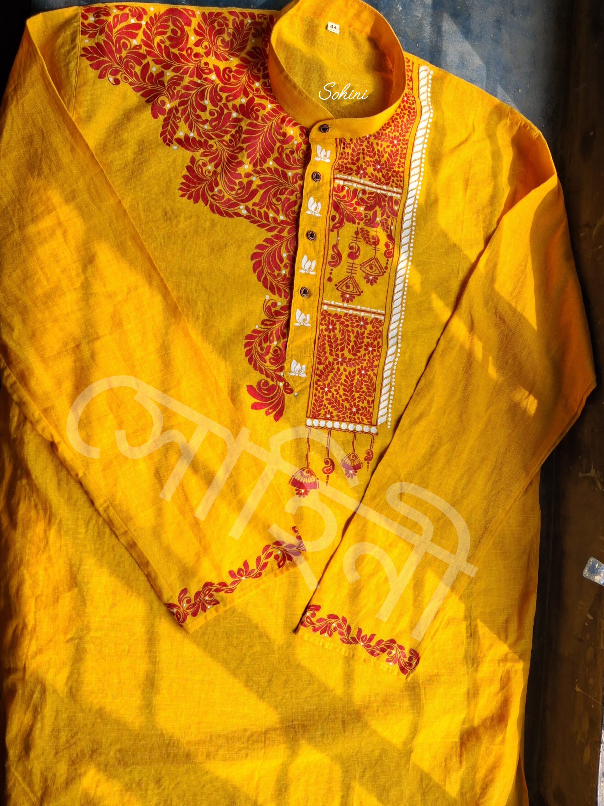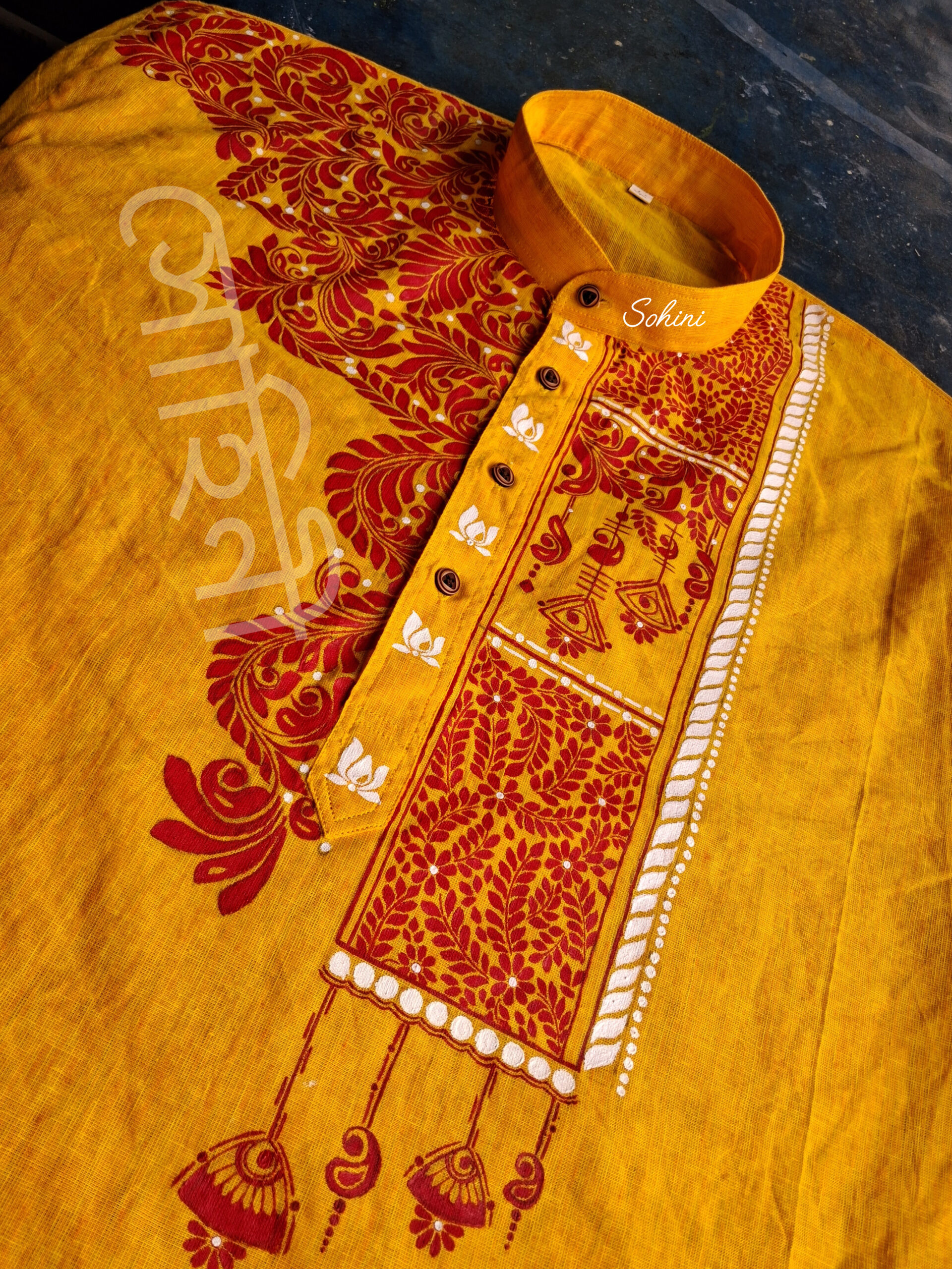Upgrade your festive wardrobe with this handprinted yellow Panjabi, crafted from premium quality cotton. Designed with intricate red hand block prints and detailed embroidery, this Panjabi offers a blend of tradition and modern elegance.