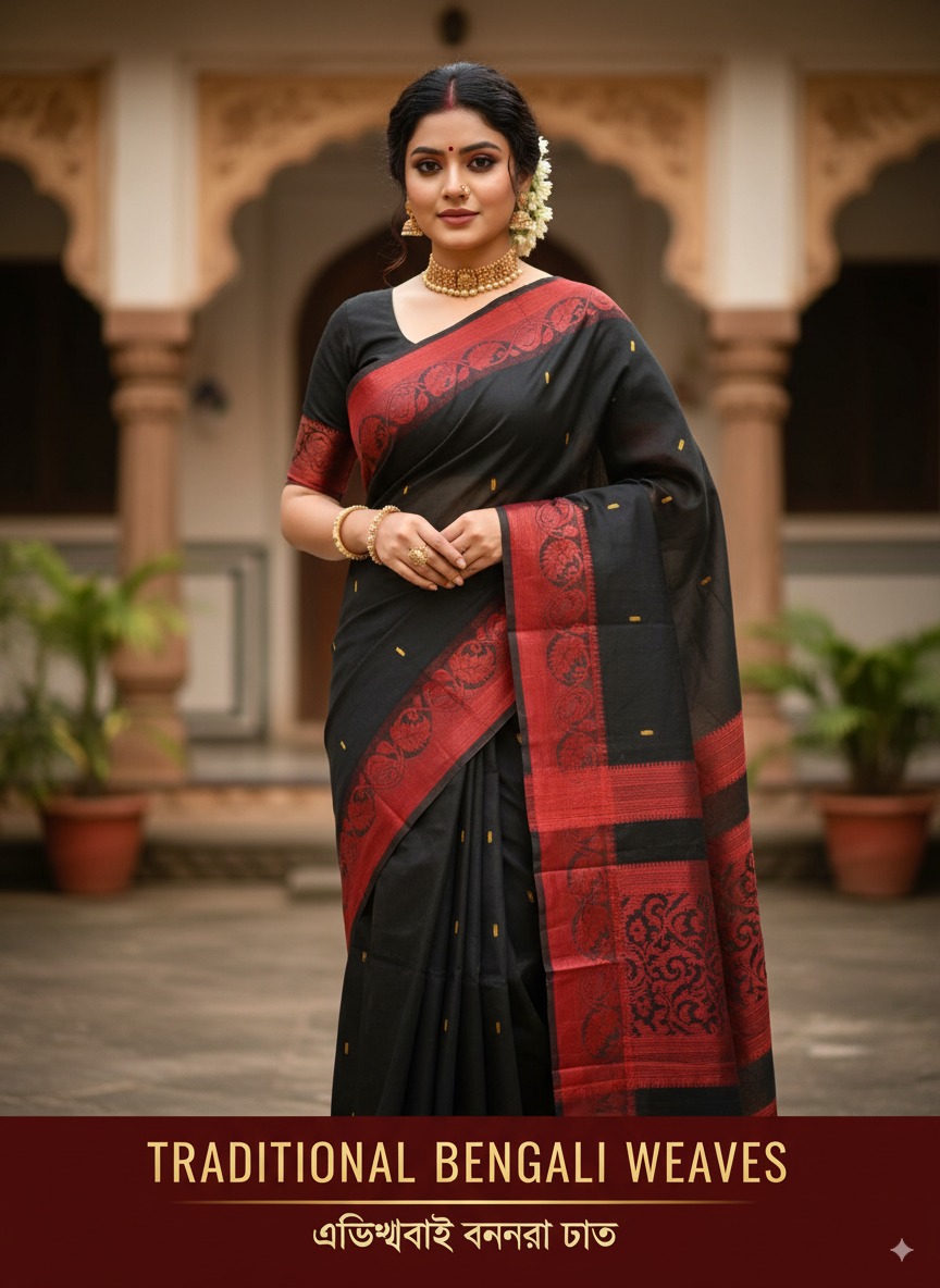 This saree beautifully blends heritage with elegance, making it a must-have in every ethnic wardrobe. Pair it with gold jewelry and a matching blouse to complete your authentic Bengali traditional look.